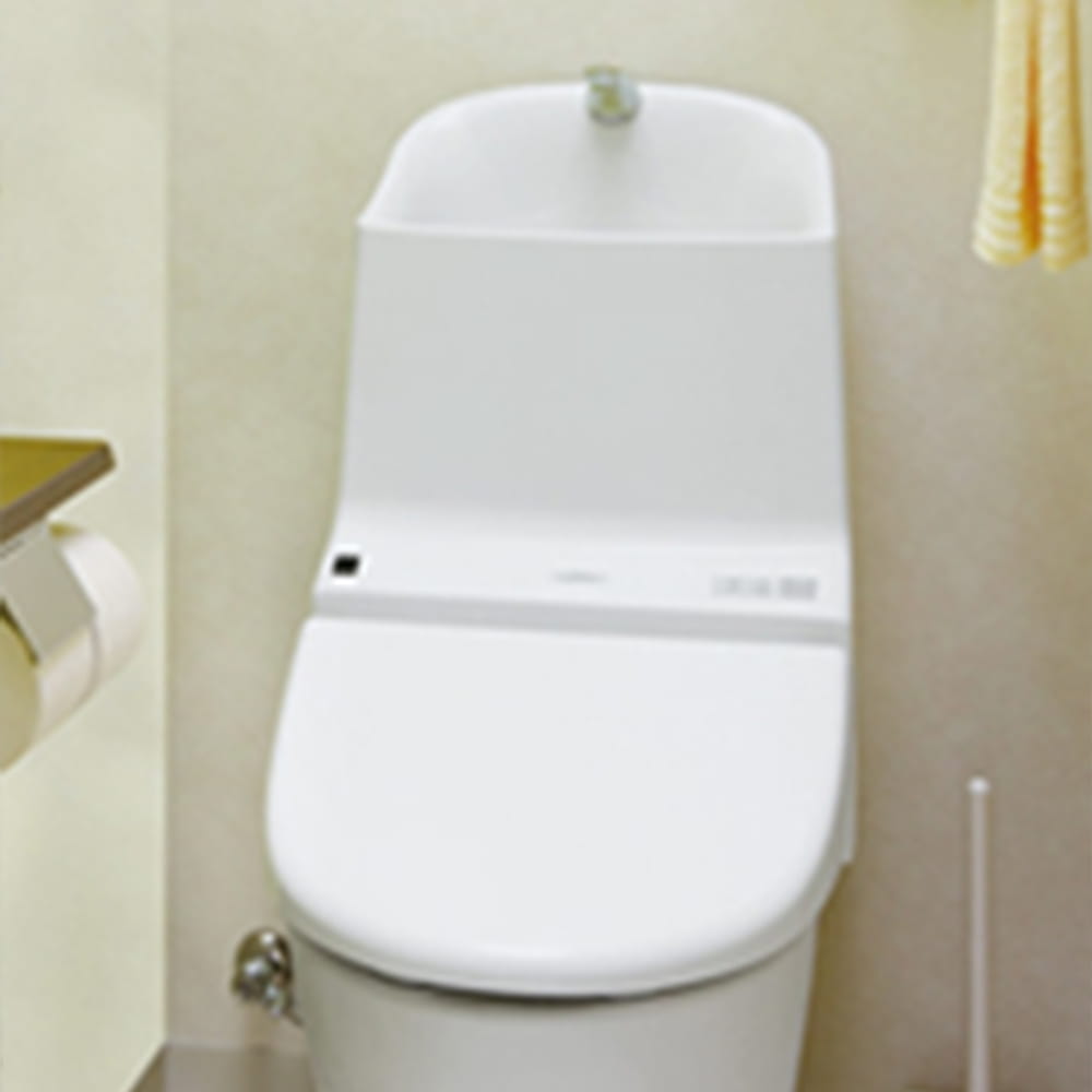 ウォシュレット一体型便器。体に優しく、とても衛生的なウォシュレットを採用しました。リモコン付きですから、便座に座ったままの楽な姿勢で各種機能を操作できます。